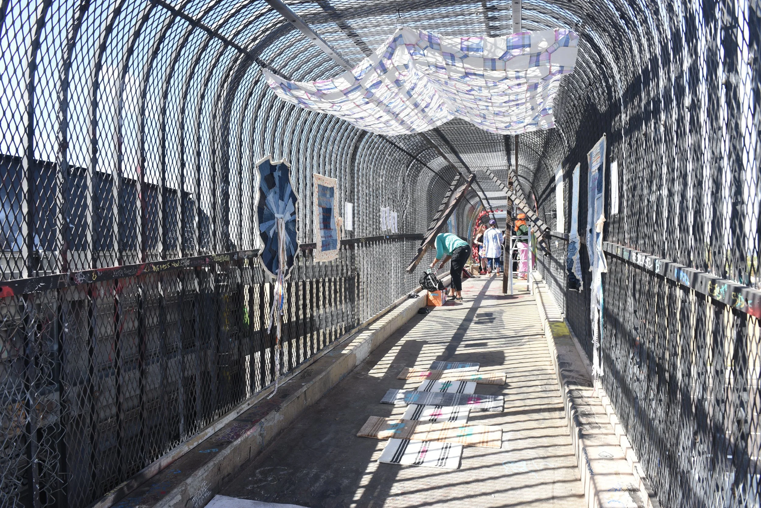 PAYDAY, Charissa Lucille’s most recent quilt series, on display February 28, 2026, as part of OH GOSH GALLEREE’s 16 Portals show on the pedestrian bridge over the 51 freeway.